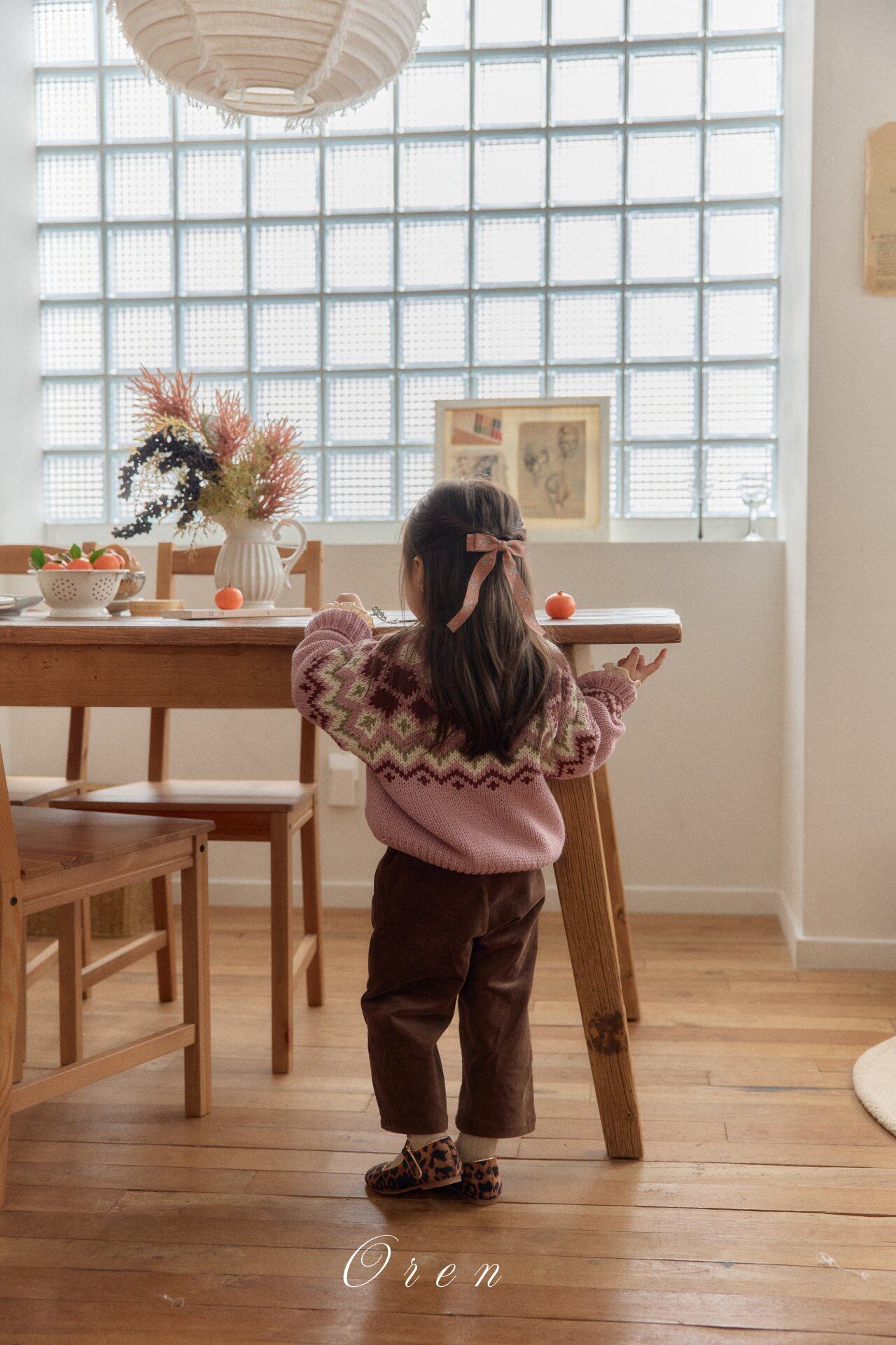 クリーム/ピンクのベースにバーガンディとオリーブのアクセントが入った北欧パターンは、